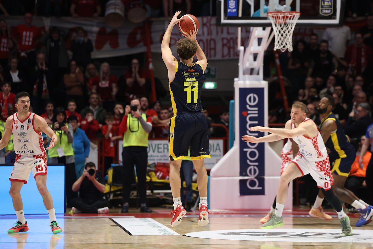 Miaschi ha il tempo solo di fare un arresto a due tempi, cercando di non appoggiare nemmeno una piccolissima parte della sua scarpa sulla linea laterale e, poi, totalmente in fuori equilibrio, con l’inerzia del corpo che lo porta verso il fondo e il bacino girato di circa 45°, si alza per tirare…1 secondo. La parabola della sfera è perfetta e si appoggia dentro il canestro senza nemmeno sfiorare il ferro, 87-88 a 46 secondi dalla fine.