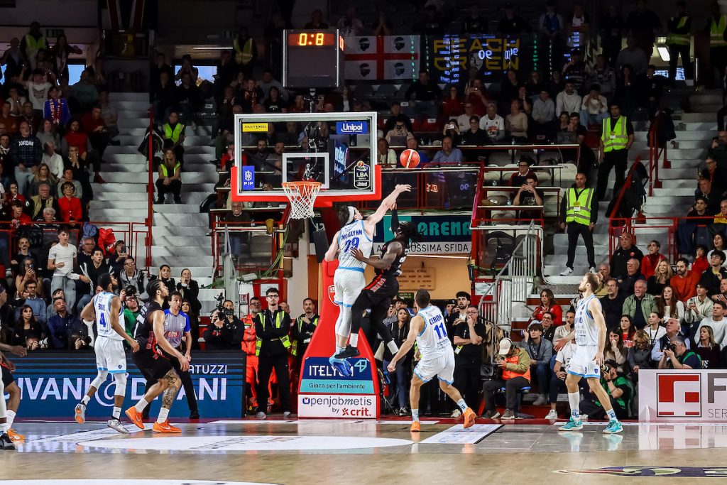 La palla mentre scende in campo, viene raccolta, ancora in caduta libera, da Nick McGlynn, che prima aveva mandato in lunetta Iroegbu. Il 29 biancoblu prende la sfera a spicchi e senza perdere un secondo si rialza in aria per appoggiare il pallone al tabellone, stavolta senza mani alle spalle che arrivano ma solo dal basso nel tentativo di sporcare la traiettoria.